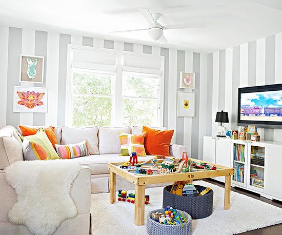 Check out this sweet set up above. What’s really great about this particular space is everything is thought out and has a place, but it’s still family friendly. There’re fun colors, clever uses of storage, and there’s no worrying about trying to put everything away. Kids are kids; people are people. Things don’t always get put up, and we don’t need to hide everything either.